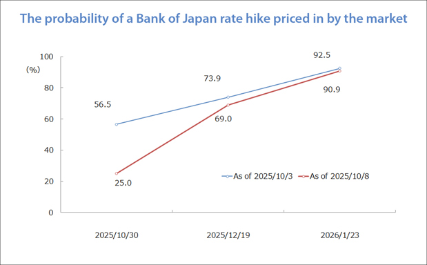 As these momentous political developments unfolded, the USD/ JPY exchange rate has rapidly progressed towards a stronger dollar and weaker yen, and on October 8 the foreign exchange market saw the rate approach 153 yen per dollar at one point. Given that Takaichi is known for her strong inclination towards fiscal expansion and monetary easing, this has intensified the pre-existing movement to sell the yen. As can be seen in the chart below, expectations for an early rate hike by the Bank of Japan have now vanished. On October 3, there was a 57% probability priced in for a 25 basis points rate hike this month, but by October 8, this probability had declined to 25%.