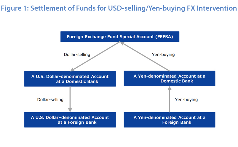 As shown in Figure 1 below, the general flow of funds in dollar-selling/yen-buying FX intervention is as follows. U.S. dollar funds are transferred from the Ministry of Finance’s Foreign Exchange Fund Special Account (FEFSA), which provides the funding for FX interventions carried out by the central authorities, to a U.S. dollar–denominated account at a domestic bank, and then onwards from there to a U.S. dollar–denominated account at a foreign bank.