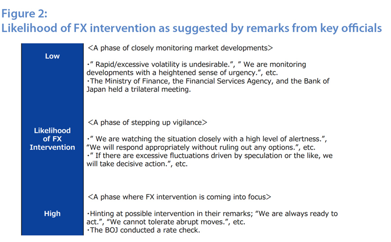 If we consider the possibility of FX intervention based on remarks by senior Ministry of Finance officials, the situation can be summarized as shown in Figure 2 below. If the yen’s sharp rise this time was driven by a rate check, the likelihood of FX intervention going forward would be high; if it was driven by actual FX intervention, the likelihood is high that intervention will continue intermittently. In addition, as the market has also been speculating that the Japanese and U.S. authorities acted in concert, moves toward yen depreciation are likely to be restrained for the time being.